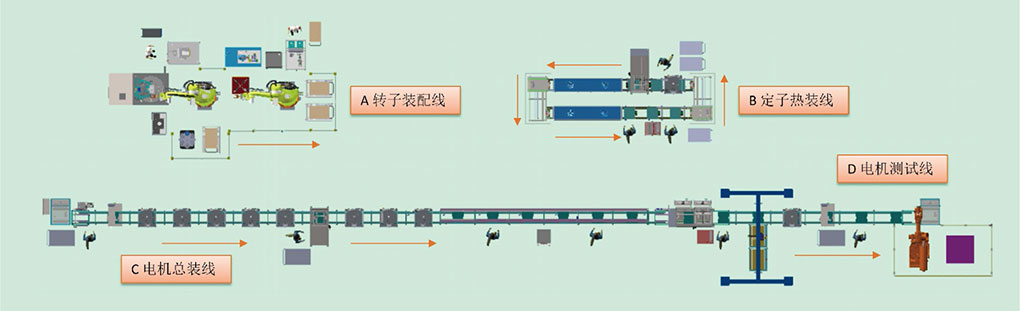 2、本线组成:转子自动装配线、定子自动热装线、电机合装线、整机测试线。